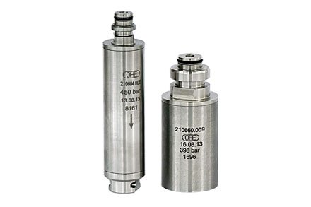 The safety valve is used to limit the pressure in a hydraulic circuit (either in the hydraulic cylinder or in the feed circuit) to a specified pressure level (the set pressure of the safety valve). The safety valves of OHE are spring-loaded and nitrogen-filled.